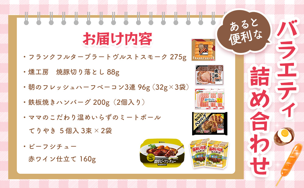 卵、乳成分、小麦、牛肉、豚肉、鶏肉、大豆、ごま