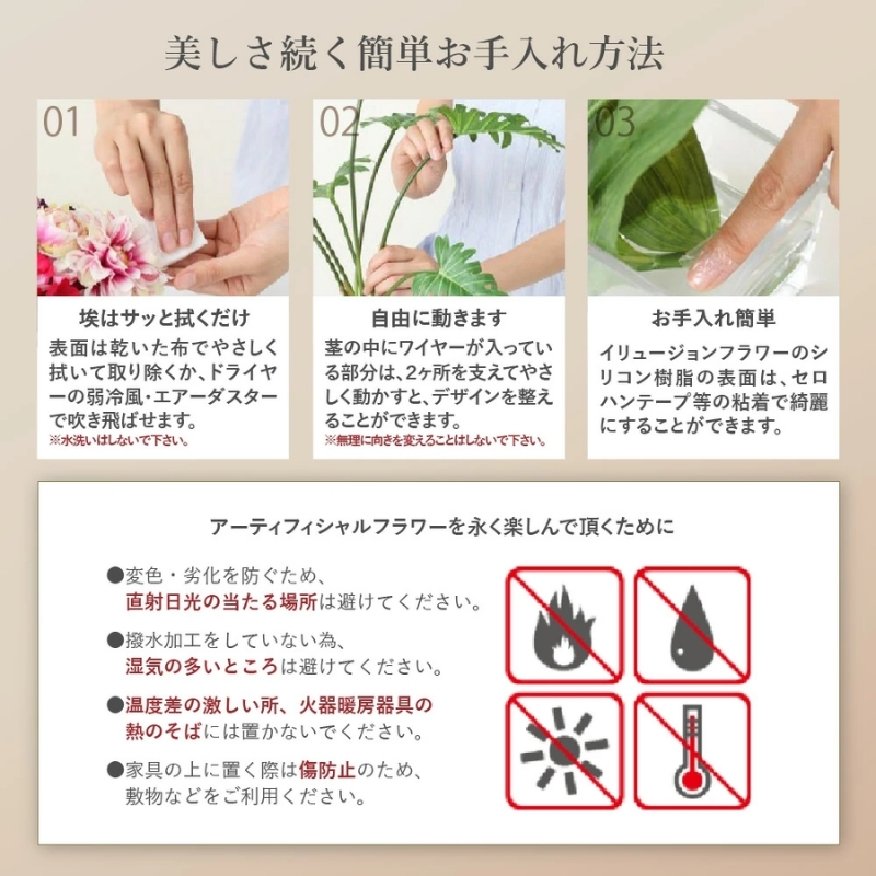 生の観葉植物は水やりや日光浴など日頃の管理が必要ですが、アーティフィシャルグリーンならお手入れも簡単で面倒な管理は一切なし。