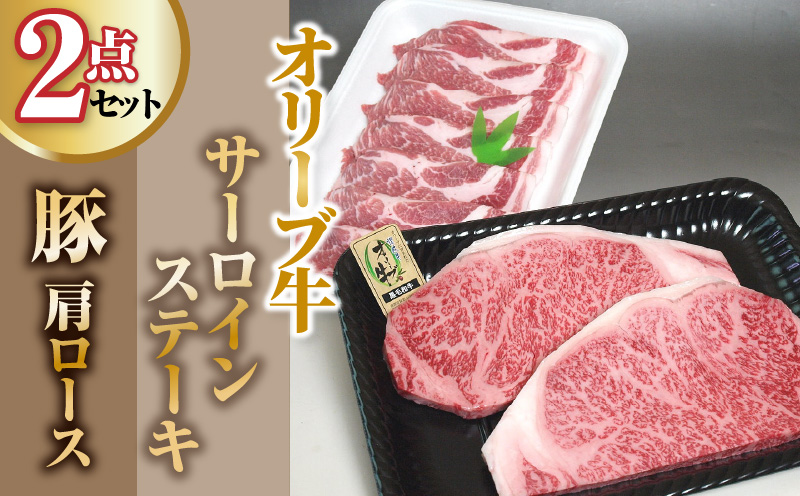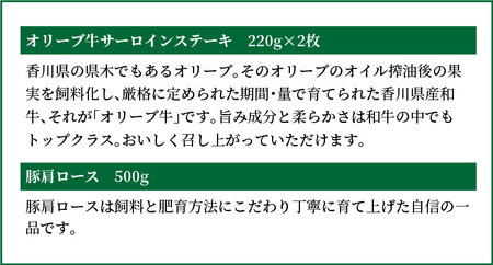 オリーブ牛サーロインステーキ220g×2枚・豚肩ロース500gセット 柔らかい肉質 霜降り 鉄板焼き 生姜焼き ポークソテー 冷凍