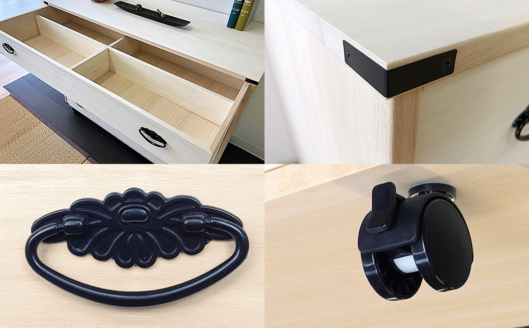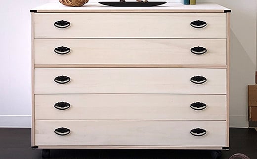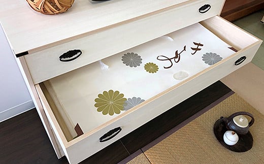 菊の花デザインの和風取っ手をあしらった落ち着きのある桐タンス。