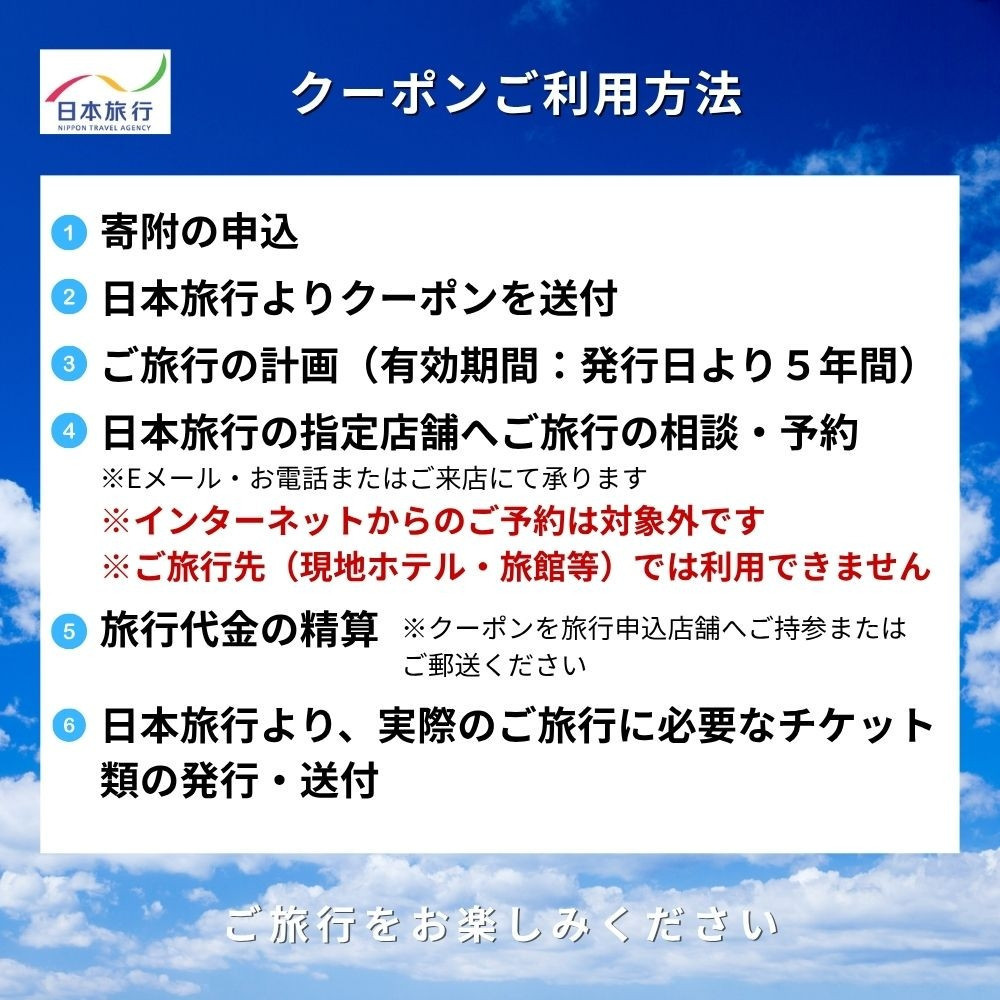 ■当クーポンは寄付自治体内の宿泊施設に宿泊する旅行をお申し込みの場合に限りご旅行の精算にご利用いただけます。なお、合わせて寄付自治体外の宿泊施設の予約を承ることも可能ですが、寄付自治体外の宿泊代金の精算に当クーポンをご利用いただくことはできません。