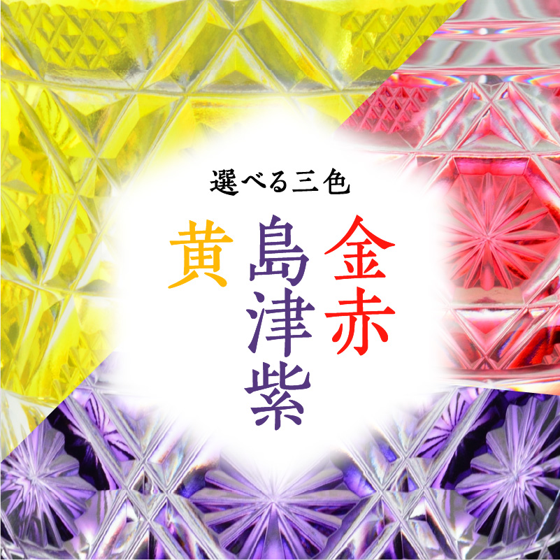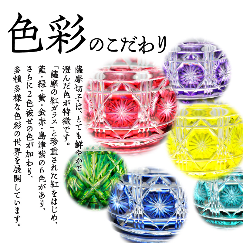薩摩切子は透明なガラスに色ガラスを1〜5mm位に厚く被せ、カット(切子)をすることにより、色ガラスの厚さの変化によってグラデーションを施した色被せカットグラスです。