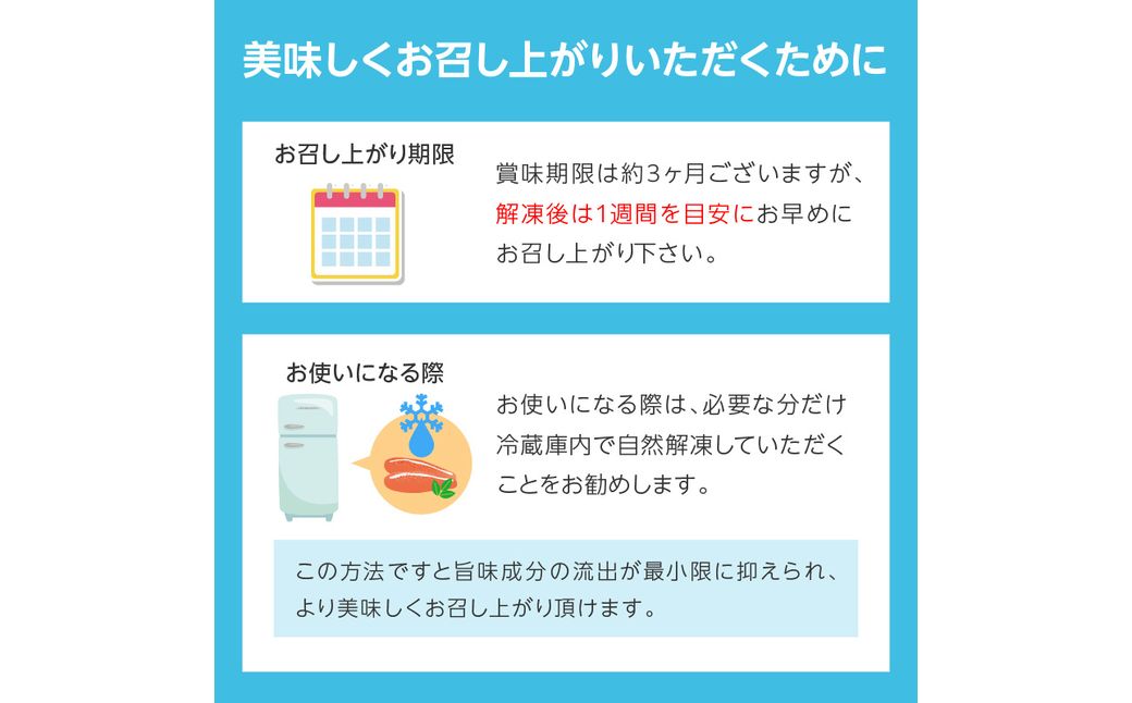 賞味期限は約3ヶ月ございますが、解凍後は1週間を目安にお早めにお召し上がり下さい。
