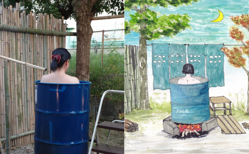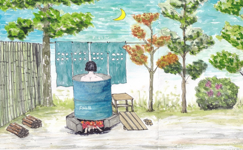 体験内容→抹茶体験、自然観察、薪割り体験、ドラム缶風呂、囲炉裏バーベキュー