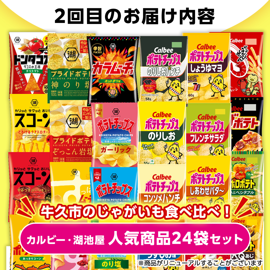 茨城県牛久市のじゃがいも食べ比べ スナック菓子を毎月定期便でお届けいたします。
