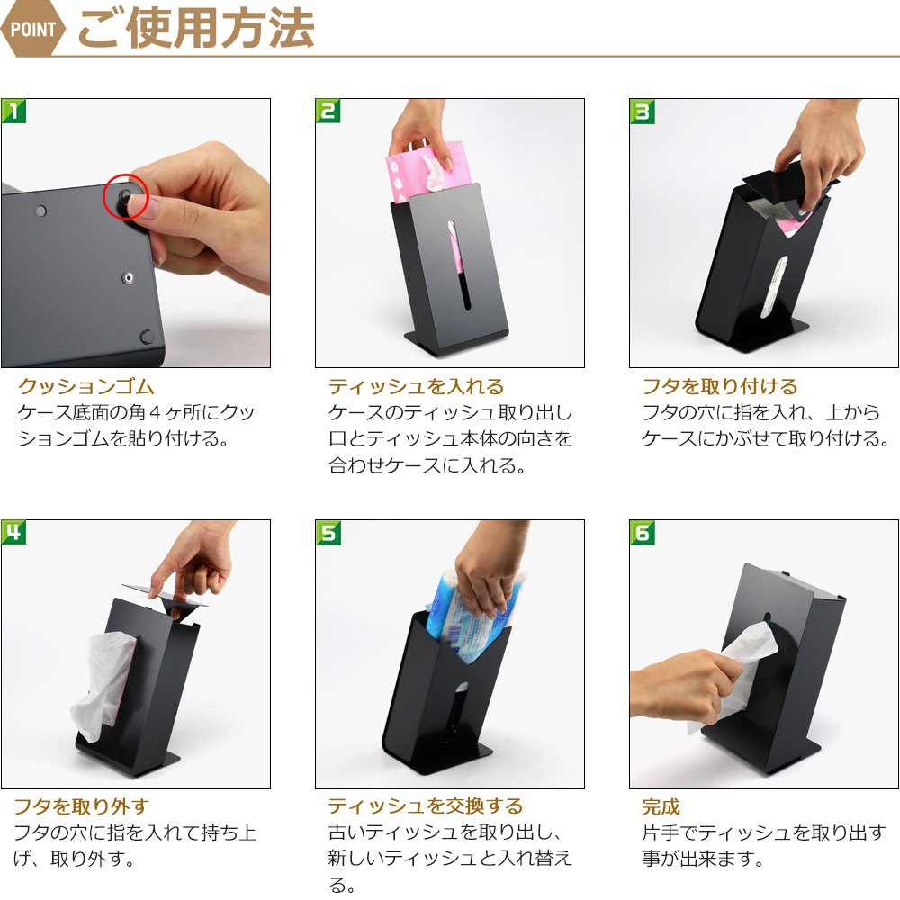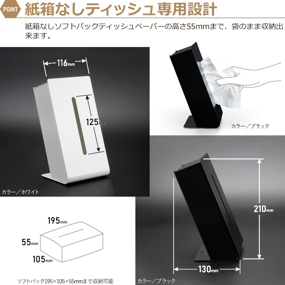 ソフトパックのティッシュをスタイリッシュに収納し、取り出しやすい構造になっており、日常の使い勝手を考慮した設計がされています。
