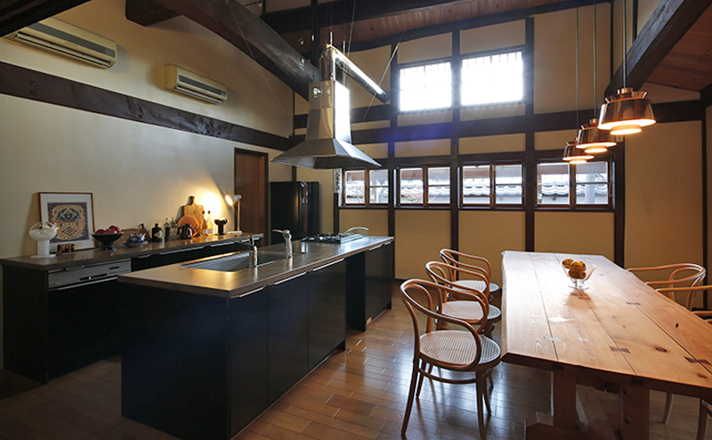 天井が高く解放感のあるキッチンダイニングには、ガスコンロ、電子レンジ、オーブンを始め、茶道具やコーヒーメーカー、調理器具が揃っています。エアコン、床暖房も完備しています。
