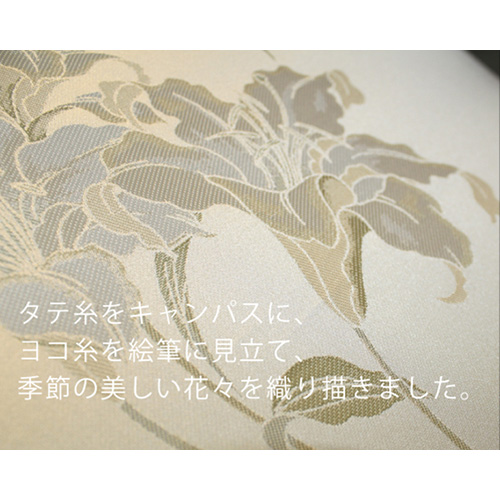 タテ糸をキャンバスに、ヨコ糸を絵筆に見立て、季節の美しい花々を織り描きました。傘に大きく咲き誇る華麗な花たちは、ダイナミックさと繊細さを兼ね備え、見る人の心を惹きつけます。花束を思わせるデザインは、織物ならではの高級感とも相まって、贈り物にも最適な1本です。お好みの花や、時期に合わせてコーディネートを楽しむこともできます。夏にはもちろん、実は1年を通してご注文をいただくほど、シリーズの中で最も人気の柄です。本物の向日葵のように、多くの人の心を明るく、元気にしてくれます。