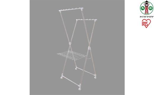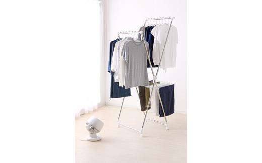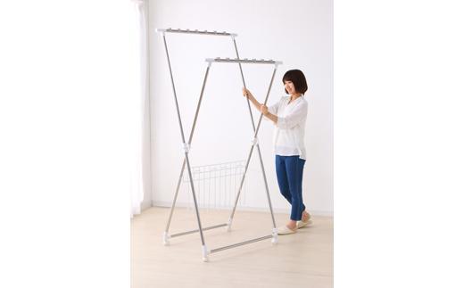 風の通りを考え、乾きやすさを追求した室内物干しです。風が奥まで抜けやすく、高さ違いの2段構造で後ろの洗濯物にも風が当たる設計です。風でハンガーが片寄るのを防ぐ固定パーツが付いています。移動に便利なキャスター付きで、使用しないときは折りたたんでコンパクトに収納できます。