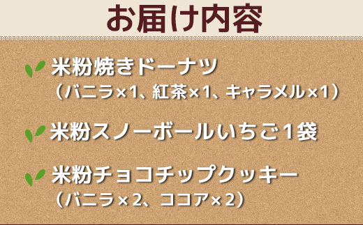 卵(国産)、富山県産米粉、バター、砂糖、ベーキングパウダー、生クリーム、はちみつ(国産)、バニラ、紅茶パウダー、キャラメルパウダー、アーモンドパウダー、牛乳、いちご強化果汁、チョコチップ、ココアパウダー