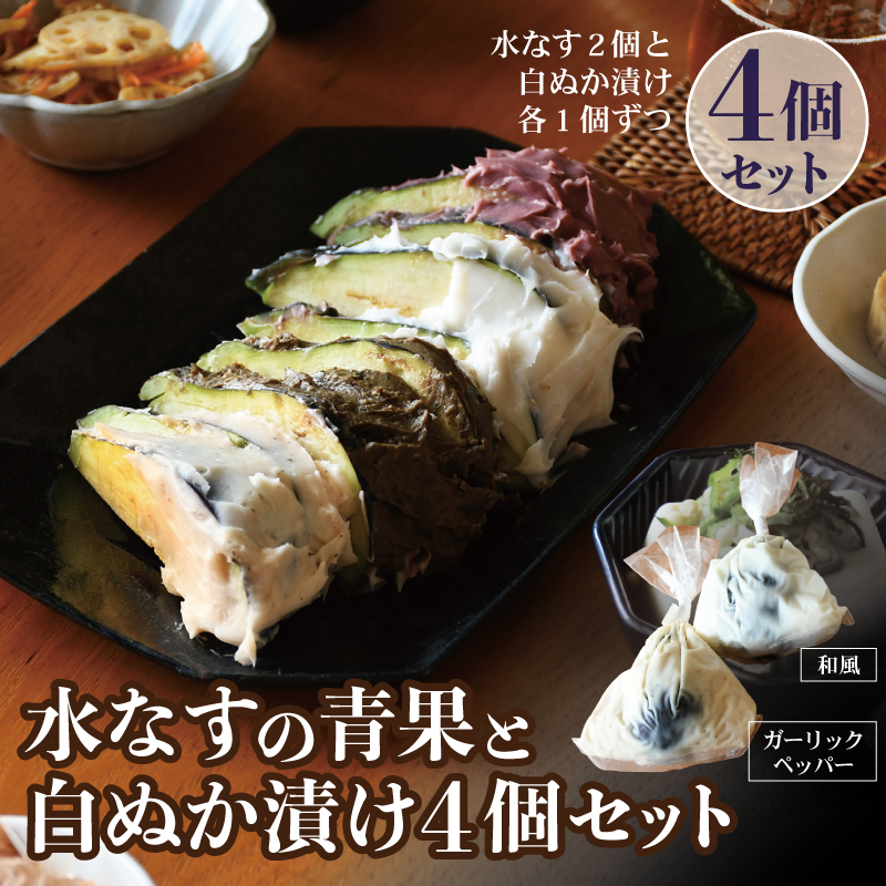 水なすの青果(2個)、白ぬか漬け(お届け予定風味:和風、ガーリックペッパー 各1個)計4個