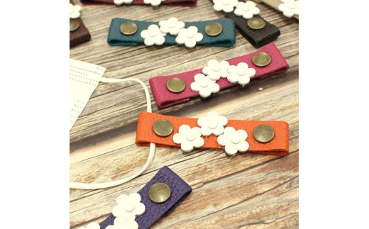 本革でお洒落を纏ったマスクカバー3つのホワイトの花レザーで高級感とかわいいを演出。付け方次第でヘアアクセサリーにも見えます!