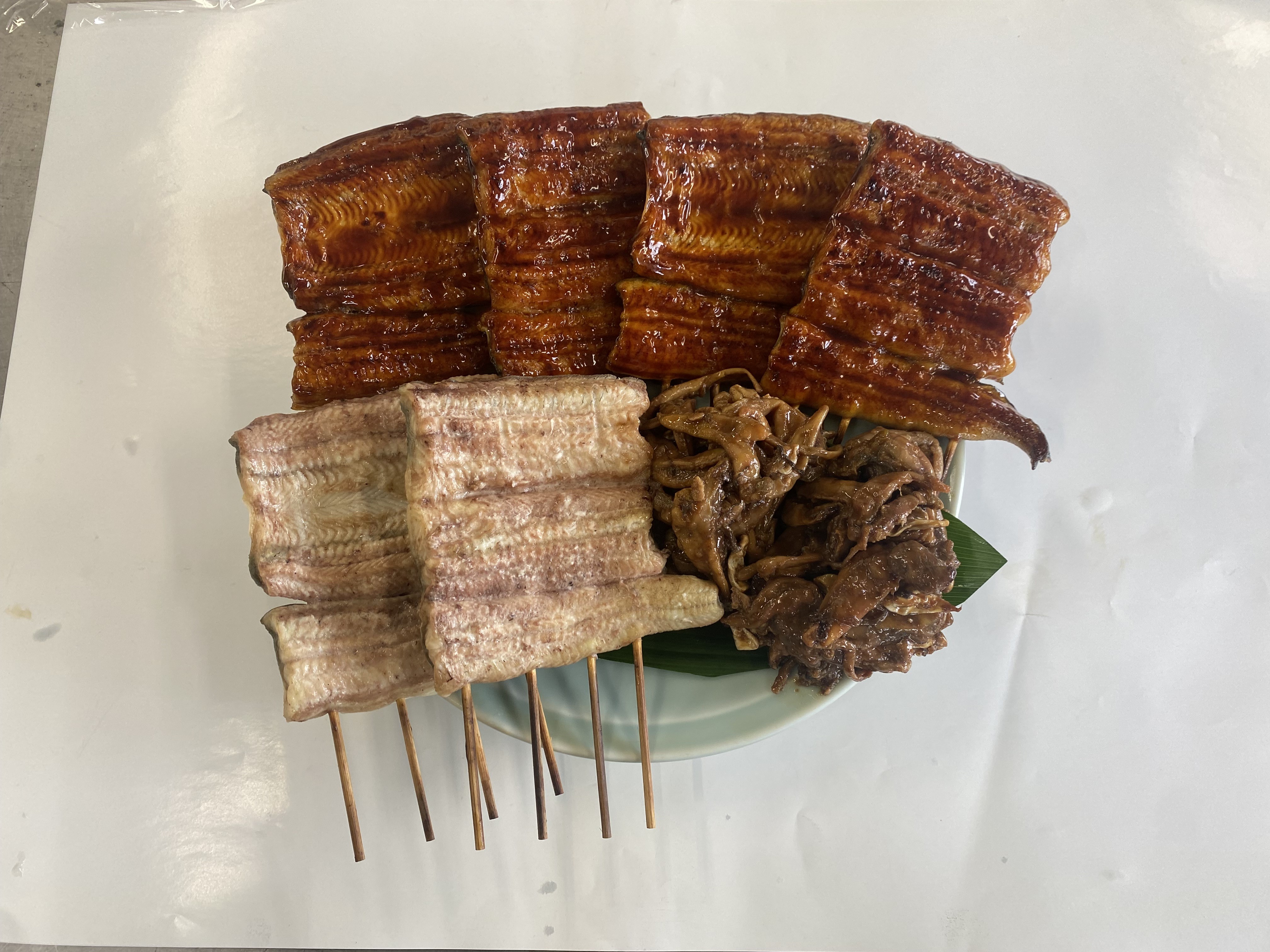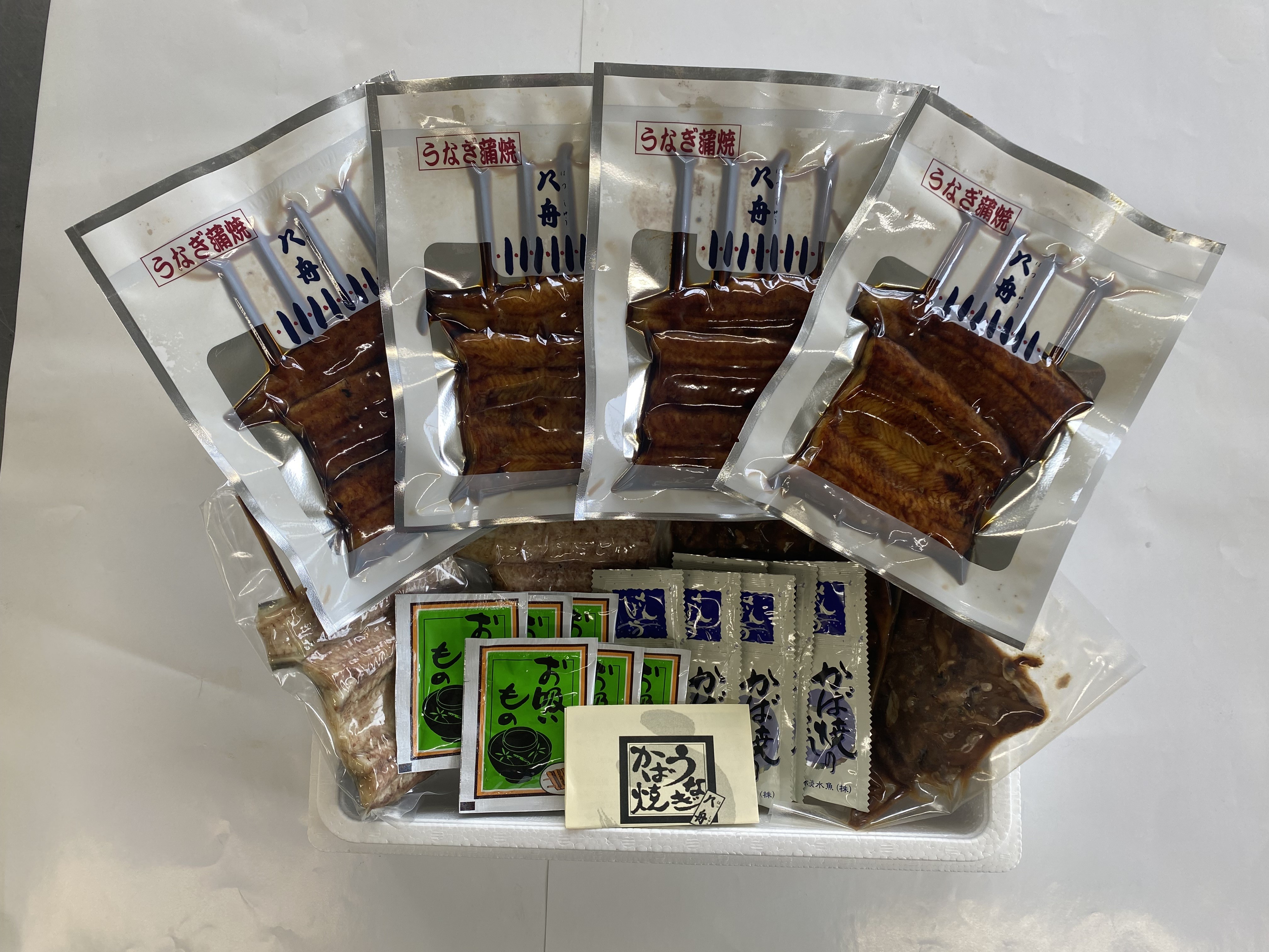鰻蒲焼真空パック:約90g×4、鰻白焼真空パック:約90g×2、鰻肝蒲焼真空パック:約100g×2、たれ・さんしょう:6個、吸物:6個