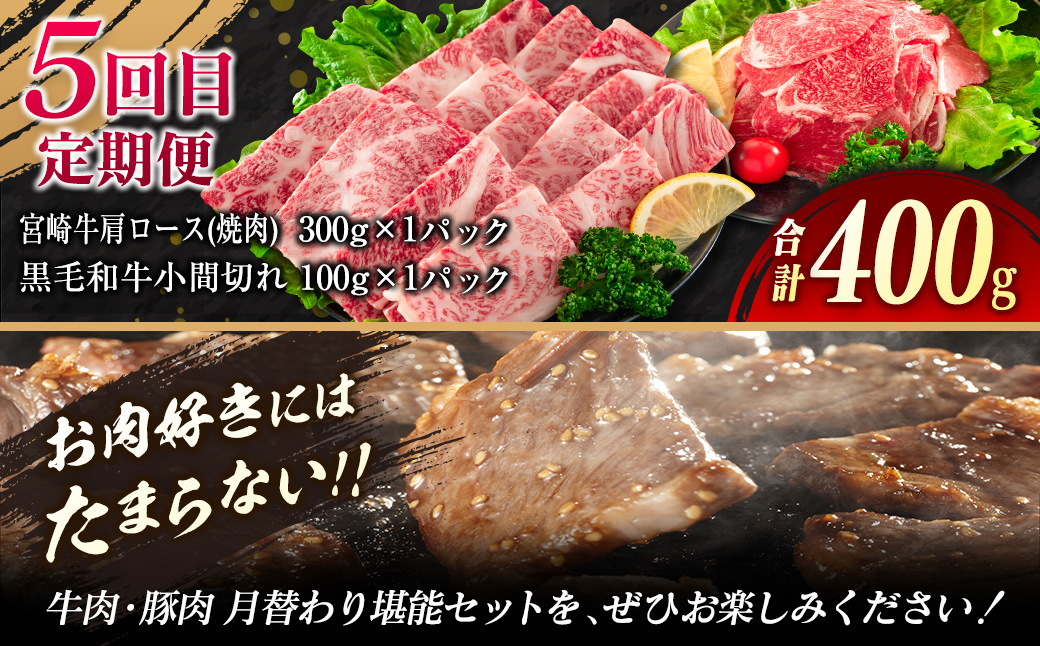 「宮崎牛&黒毛和牛」と「宮崎県産豚肉」を、 5か月間月替わりでお届けする『牛肉・豚肉の月替わり堪能セット』を返礼品としてご用意いたしました。