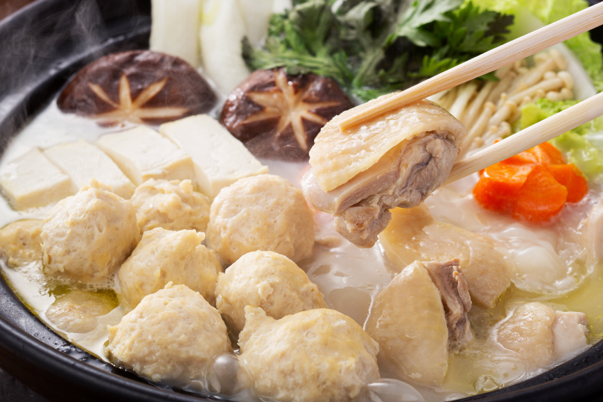 はかた地どりを、はかた地どり鶏ガラスープで頂く、本場博多の水炊きセット。九州福岡博多の郷土料理でもある美味しくヘルシーな水炊きを、ありたどりのつみれ(鶏団子の練り物)と柚子胡椒を添えてお召し上がりください。シメは溶き卵を入れて鶏雑炊が絶品です。