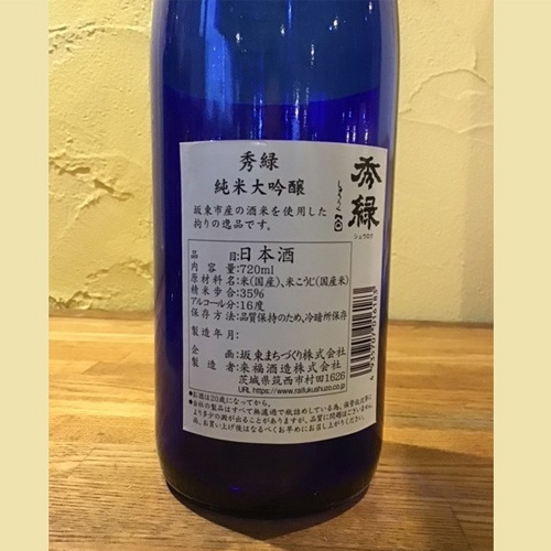 当お礼品は坂東産酒米ひたち錦(茨城県オリジナル品種)を使用した日本酒、「秀緑」純米大吟醸になります。