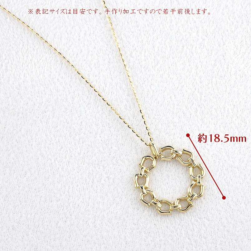 「馬が9個あるとうまくいく」「輪の形は物事を丸くおさめる」と言われることから、全てがうまくいくことを願って馬蹄を9個サークル状にデザインしたペンダントネックレス
