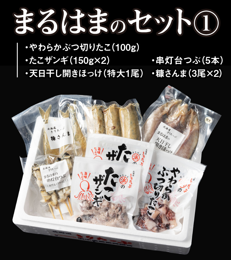 たこザンギ:柳だこ(北海道浜中沖)、醤油(国内製造)、米発酵調味料、砂糖、おろしにんにく、おろし生姜、肉エキス、魚醤(一部に小麦・大豆・鶏肉・豚肉を含む)