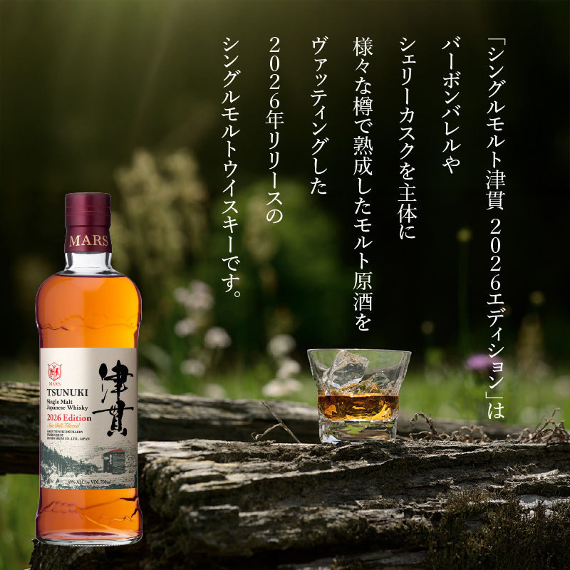 「シングルモルト津貫2026エディション」は、バーボンバレルやシェリーカスクを主体に様々な樽で熟成したモルト原酒をヴァッティングした2026年リリースのシングルモルトウイスキーです。