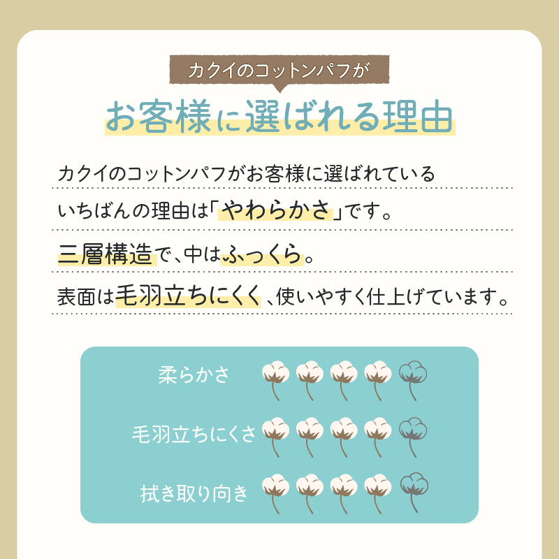 「三層構造」の中心にクッション性のあるコットンを使用し、表裏面に毛羽立ちにくいコットンを使用することで、ふっくらやわらかな感触の仕上がりになっています。