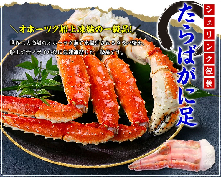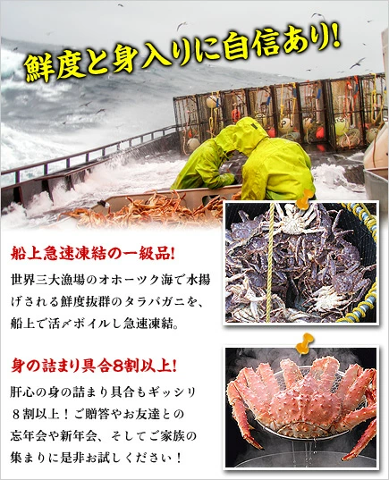 世界三大漁場のオホーツク海で水揚げ直後に船上で活〆ボイルし、美味しさそのまま急速凍結した一級品です。自然解凍するだけで、まるで未冷凍のような身質と食感、そして身離れの良さを実現しました。とても冷凍品とは思えない、活茹での味と殆ど変らない抜群の味にビックリすること間違いなし!大きさといい、味といいタラバガニの魅力を存分に楽しめる逸品です。