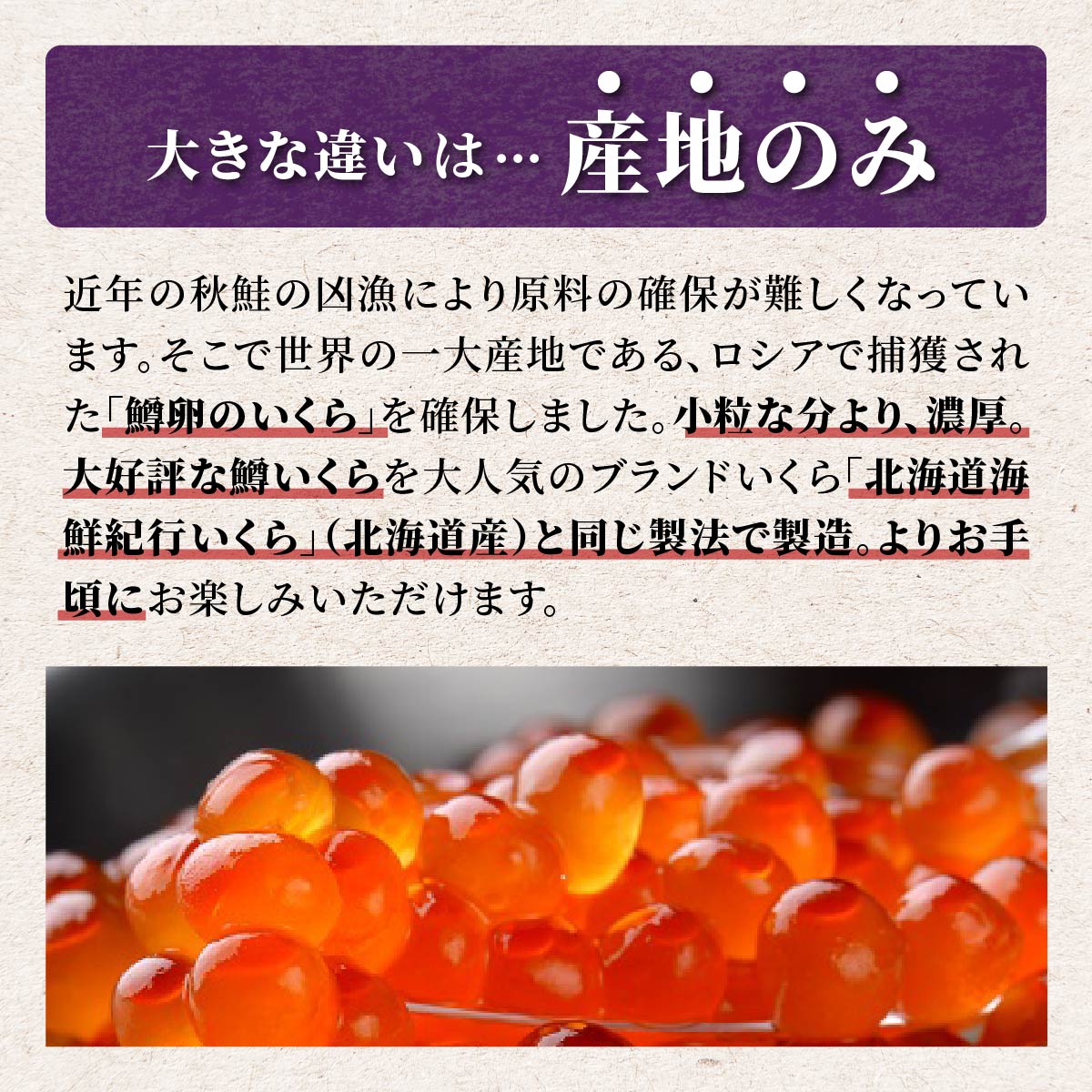 秋鮭漁の凶不漁が続いていることから、原料の確保が非常に難しい状況であるため、外国産鱒卵で作ったいくらをお礼の品にご用意しております。