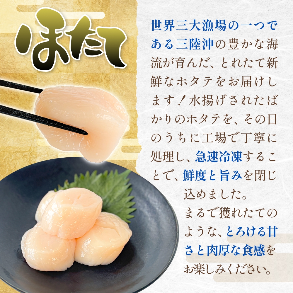 水揚げされたばかりのホタテを、その日のうちに工場で丁寧に処理し、急速冷凍することで、鮮度と旨みを閉じ込めました。