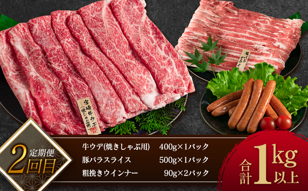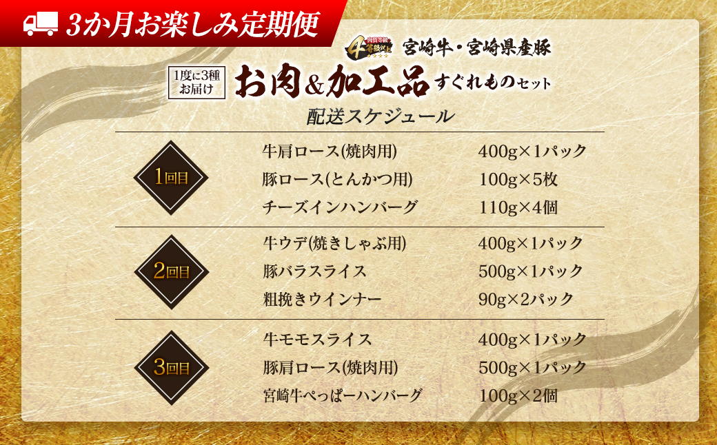 畜産王国宮崎県から、「牛肉」「豚肉」と「加工品」をセットにした『≪3か月お楽しみ定期便≫お肉&加工品すぐれものセット』を数量限定ではございますが、特別に返礼品としてご用意いたしました。