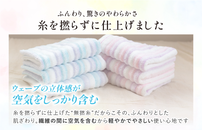 特殊な織り方によりウエーブの立体感がある構造で、糸と糸の間に隙間がたくさんでき、ポコポコと凹凸感のある、長いパイルと短いパイルが優しくお肌にあたり、吸水性にも優れています。