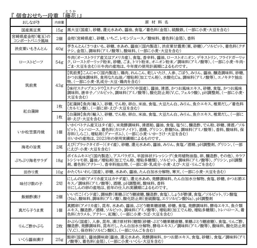 渋皮栗いもきんとん:芋きんとん(さつまいも、砂糖、水あめ、醤油)(国内製造)、渋皮栗甘露煮(栗、砂糖)/ソルビット、着色料(クチナシ、金箔)、調味料(アミノ酸等)、酸味料、(一部に小麦・大豆を含む)