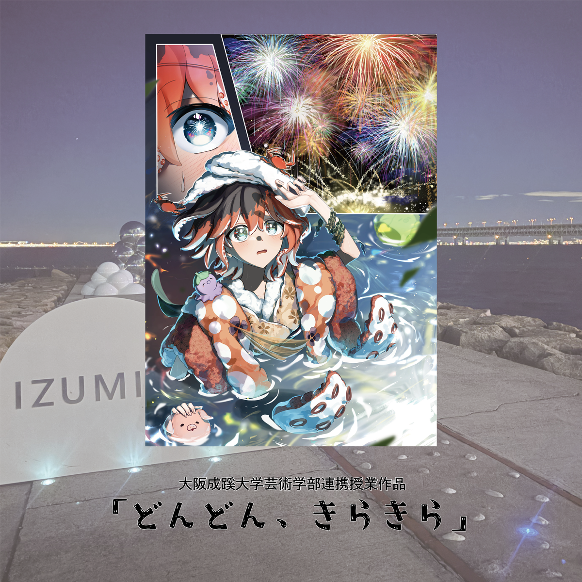泉佐野市の魅力を伝えるため、大阪成蹊大学の学生が手がけたイラストレーションです。お部屋を彩るインテリアアートとして、飾ってお楽しみいただける特別な作品です。グループでの合作で、コマごとに代表者3名がそれぞれデジタルで描いています。