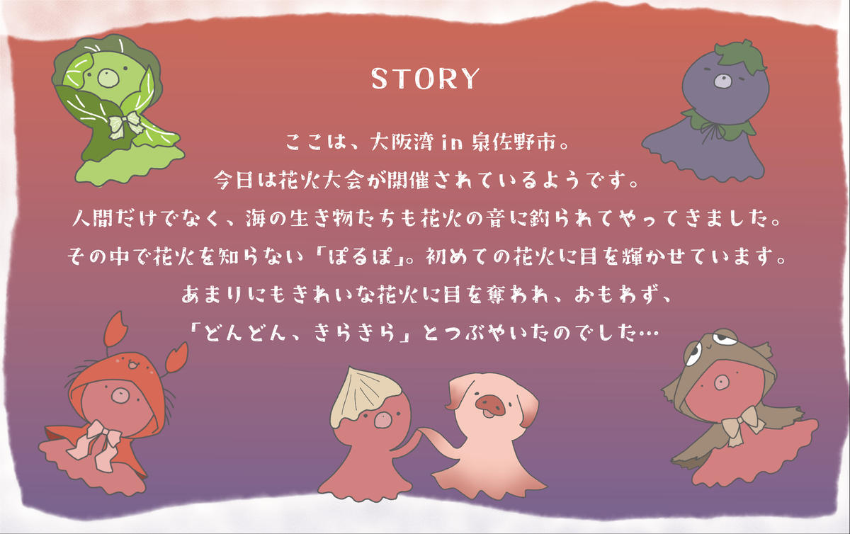 泉佐野市の大阪湾で毎年行われる「大阪芸術花火」。そんな花火の音につられて海の生き物たちがやってきました。初めて花火を見た主人公の「ぽるぽ」は花火に見とれて目を輝かせています。