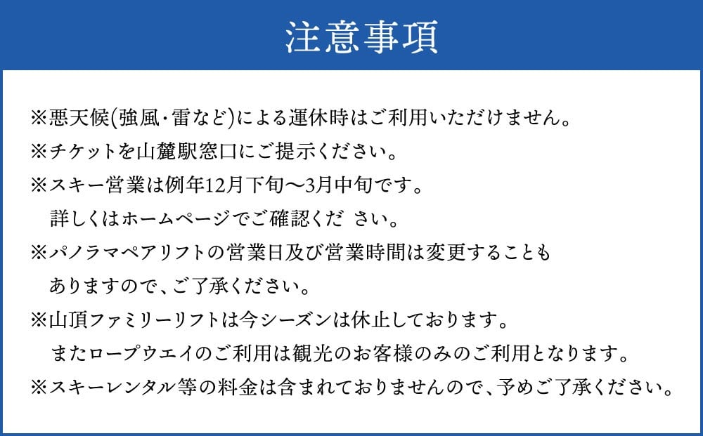 ※山頂ファミリーリフトは今シーズンは休止しております。またロープウエイのご利用は観光のお客様のみのご利用となります。