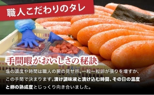 「無着色」「形の整った特選切子」「小分け」自慢の明太子は「博多あごおとし」を生産している「博多まるきた水産」製造です。