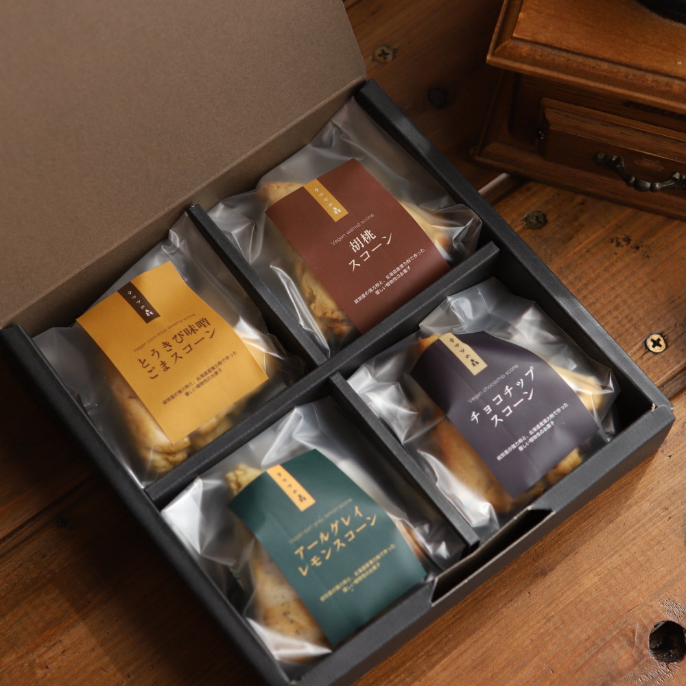 とうきび味噌ごま・くるみ・チョコチップ・アールグレイレモン。4種のスコーンを1個ずつ詰め合わせたセットです。
