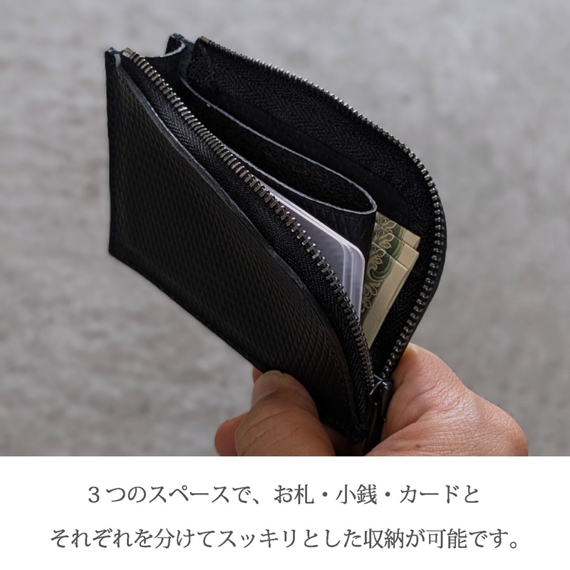 内部には3つのスペースがあり、お札・小銭・カードを分けてスッキリした収納が可能です。