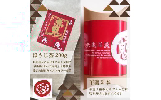 赤鬼ほうじ茶のリーフを細かく粉砕して、あっさりこしあんの羊羹に混ぜ込んだ当店限定販売の羊羹です。控えめな甘さにほんのり焙煎の香ばしさを感じます。手のひらサイズの羊羹は、1箱当たりだいたい4等分できます。
