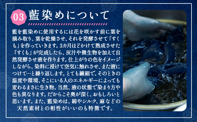 着れば着るほどに素材、色合い共に風合いが良くなりお肌に馴染み、藍染めをする事で生地の堅牢度が増します。
