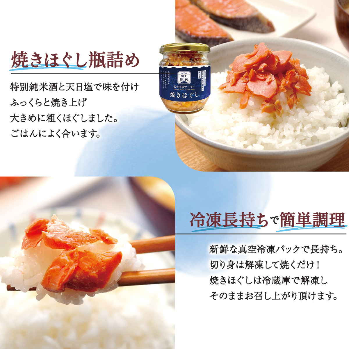 特別純米酒と天日塩で味を付け、ふっくらと焼き上げ大きめに粗くほぐしました。