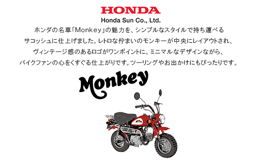 ホンダの名車「Monkey(モンキー)」の魅力を、シンプルなスタイルで持ち運べるサコッシュに仕上げました。