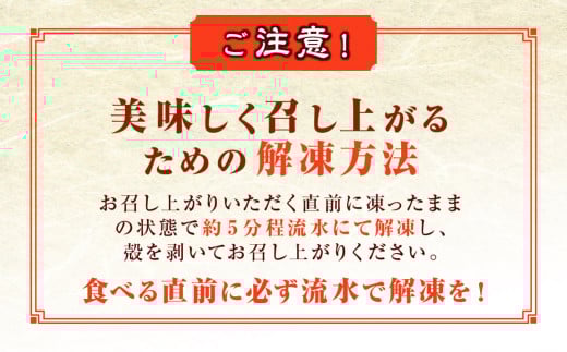 お召し上がりいただく直前に凍ったままの状態で約5分程流水にて解凍し、殻を剥いてお召し上がりください。