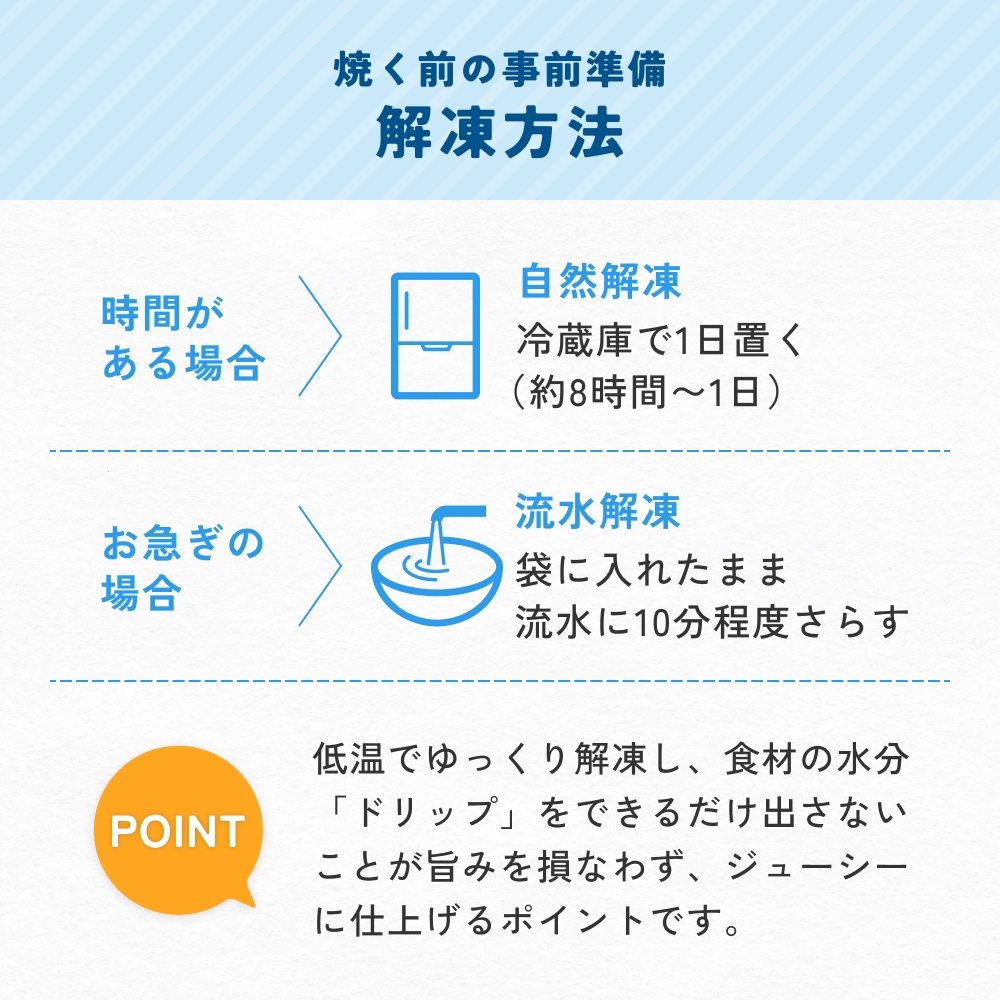 お召し上がりの際は、冷蔵庫で一晩ゆっくり解凍してから焼いていただくとむらなく火が通り、美味しくお召し上がりいただけます。