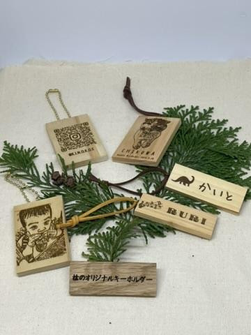 桧の小さな板にレーザー彫刻を施したオリジナルキーホルダー。ペットやお子様の写真やお子様が描いた絵や文字、お子様のお名前キーホルダーなどお作りできます。また二次元コードやお店のロゴマークのキーホルダーが作成できます。キーホルダーの紐にはさをり織りに使う木綿糸を編んだ紐を使用しています。こちらの商品は両面彫刻の商品です。