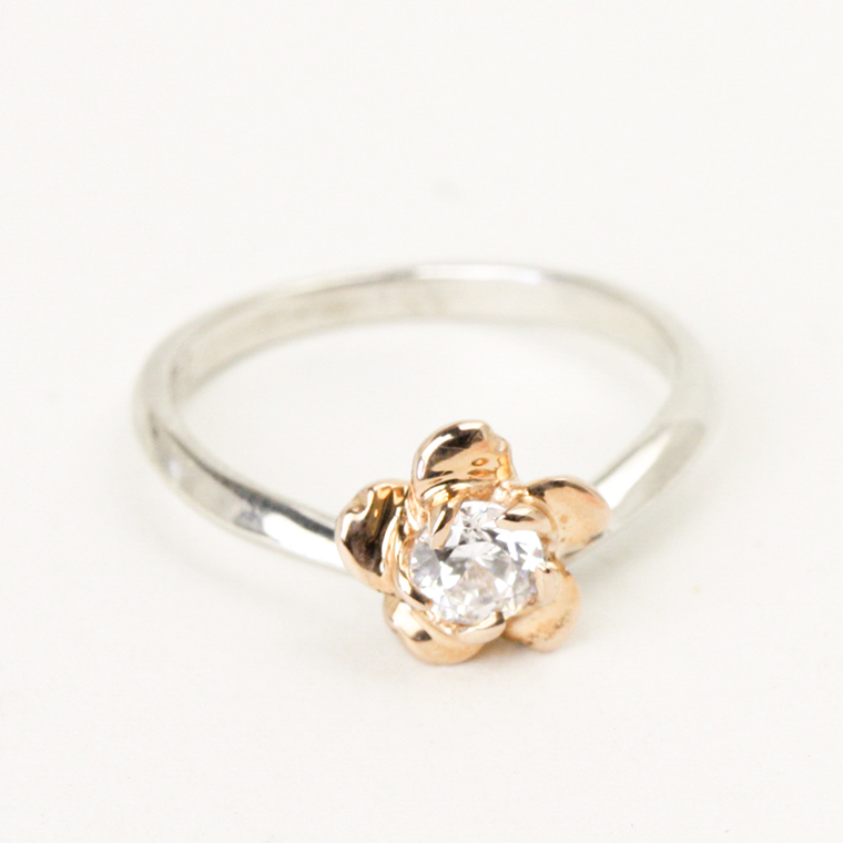腕はプラチナ、石枠は18金ピンクゴールドのコンビ使いで、ダイヤモンドをチャーミングに桜の花びらで取り巻くイメージでデザインしています。