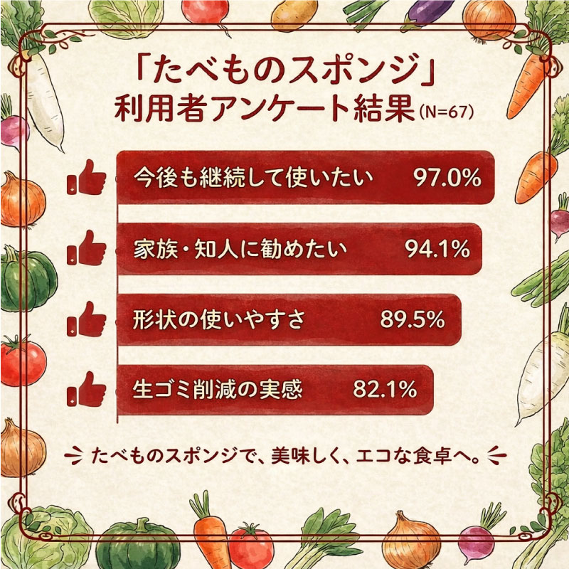 「たべものスポンジ」を使用すると、約85%の生ごみ削減につながる結果となりました。