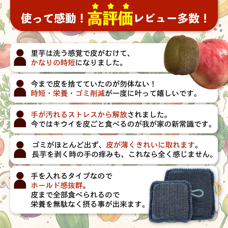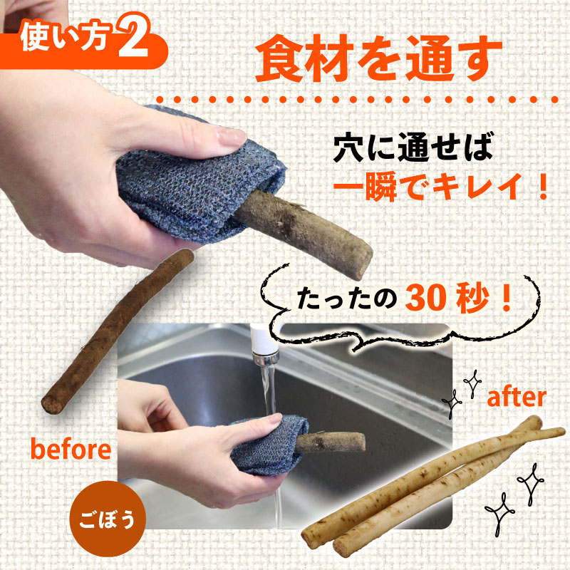 水で濡らして軽くこするだけで、泥落としから薄皮むきまで行えます。
