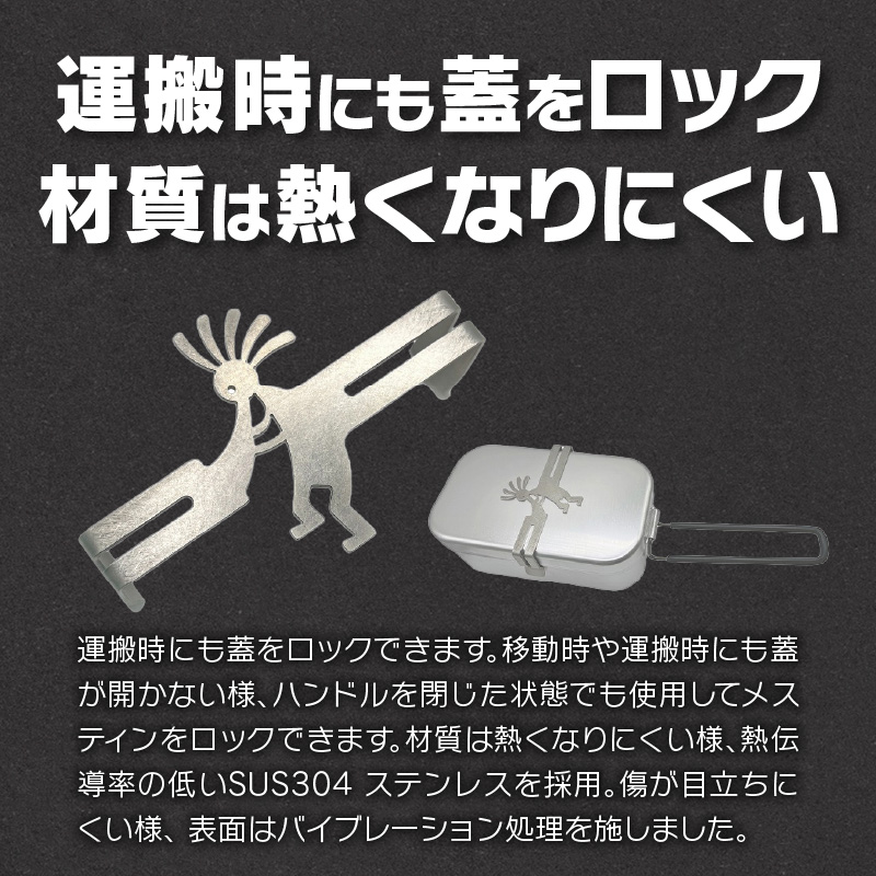 移動時や運搬時にも蓋が開かない様、ハンドルを閉じた状態でも使用してメスティンをロックできます。