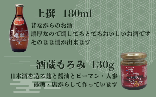 日本酒をつくる麹と醤油とピーマン・人参・砂糖・唐がらしで作っています。老松のお酒を吞みながら酒の肴にもろみをかけ食されると大変合います。