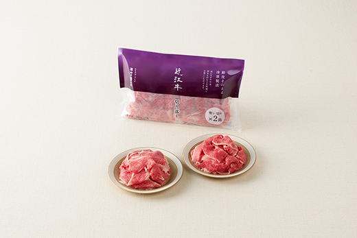 近江牛切り落しは牛丼やすき焼きに最適。赤身と脂のバランスが生む、コク深い近江牛の味をお楽しみください。