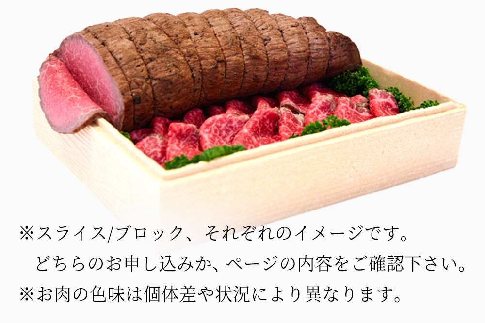 国産の黒毛和牛のウデ・モモ・肩バラを使用し、筋・脂を除去してトリミングした後、タコ糸を1.6cm間隔で巻き、柔らかい状態に仕上げたローストビーフを真空パックにしてお届けします。